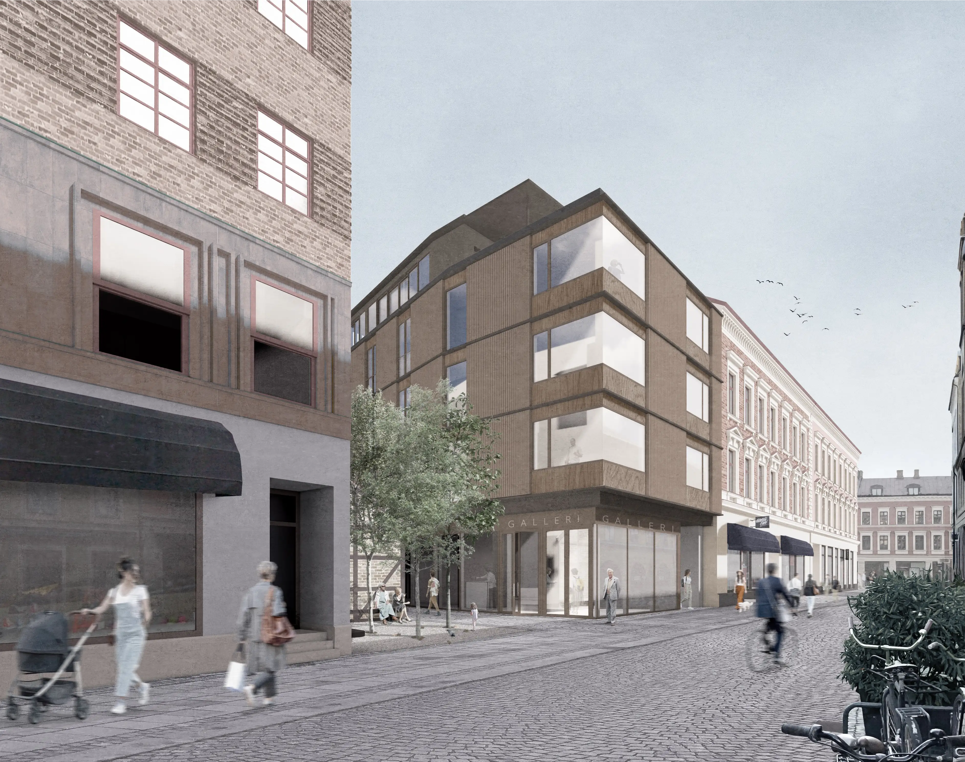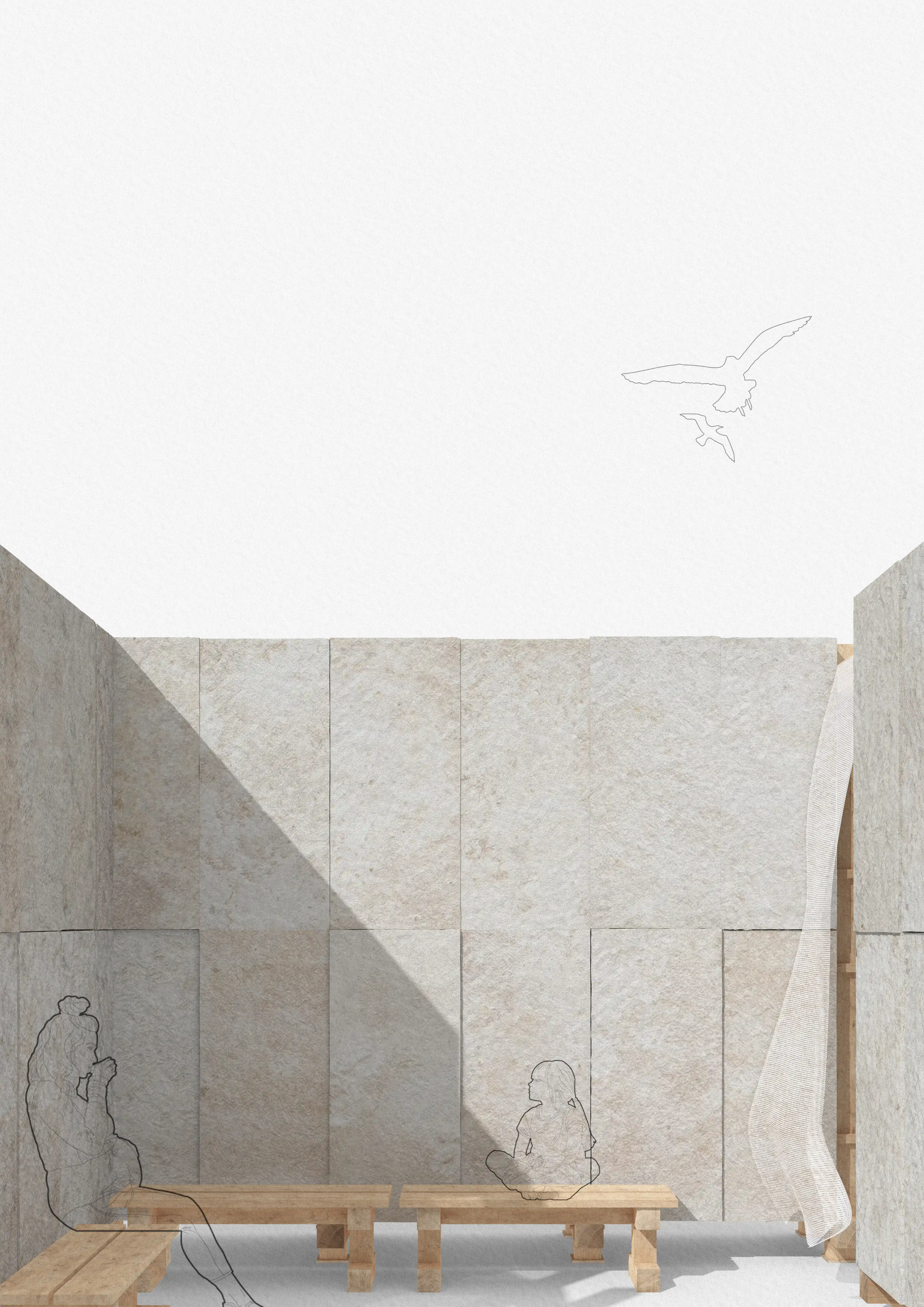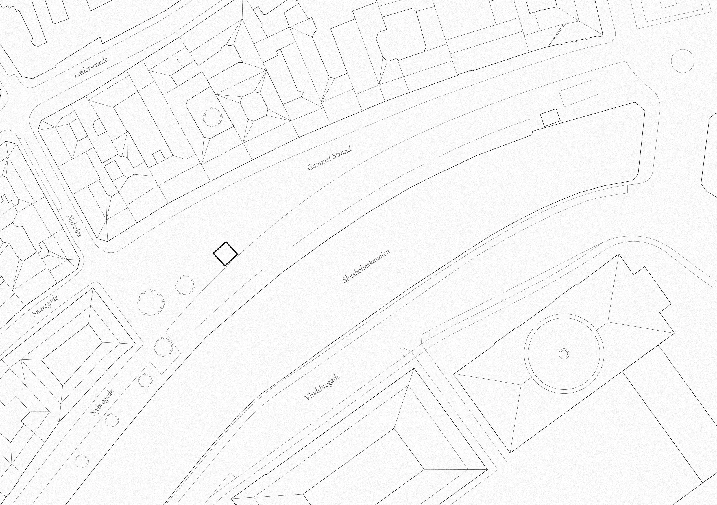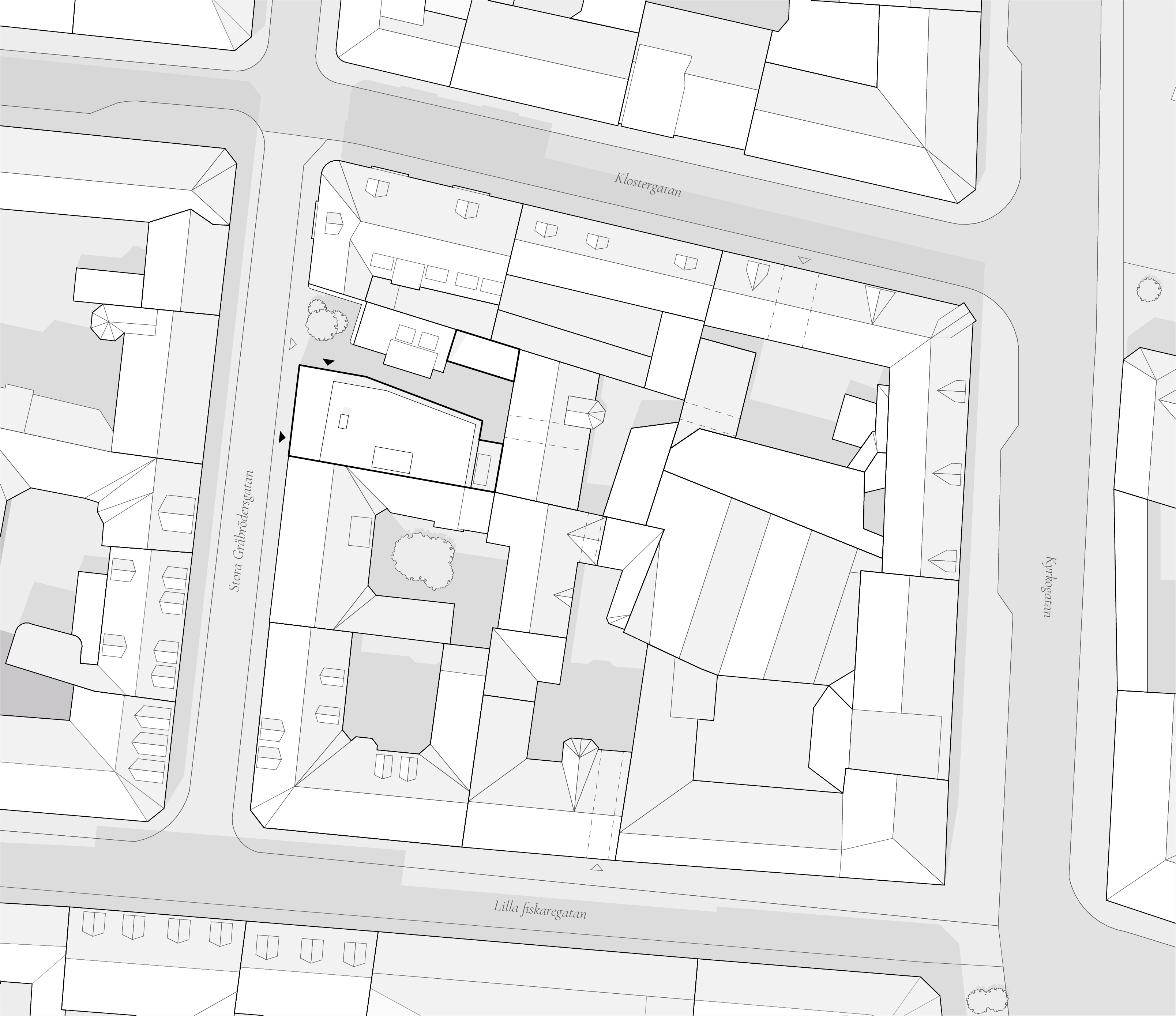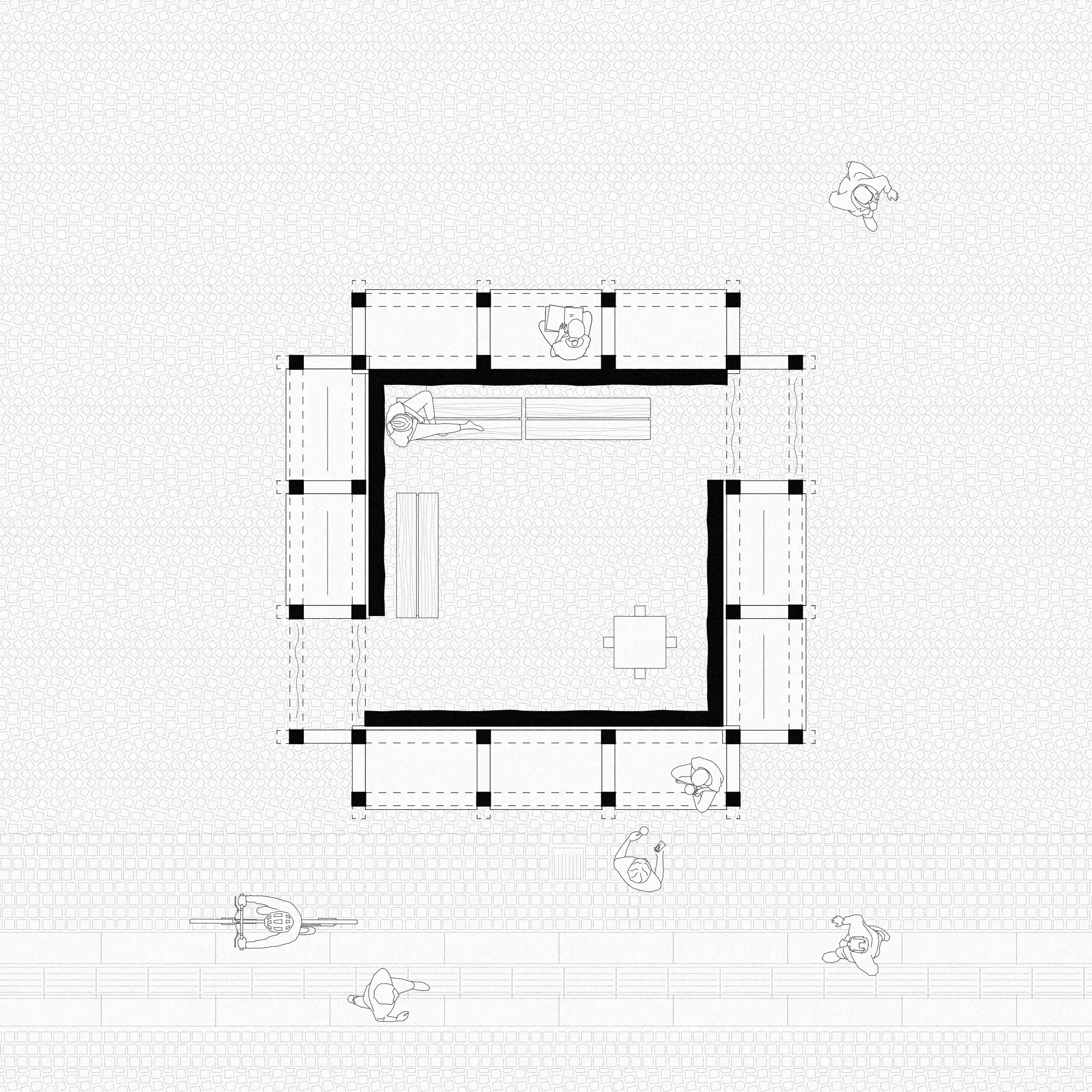 Platsen omges av ett rikt arkitektoniskt landskap av innergårdar. En slags dold, funktionell infrastruktur av slutna utrymmen, öppna mot himlen men avskärmade från den omgivande stadsmiljön. Oavsett om vi bara passerar hastigt eller dröjer oss kvar, fungerar innergårdarna som tillfälliga tillflyktsorter där vi får en chans att sakta ner, samtidigt som de väcker nyfikenhet och en vilja att fortsätta utforska.