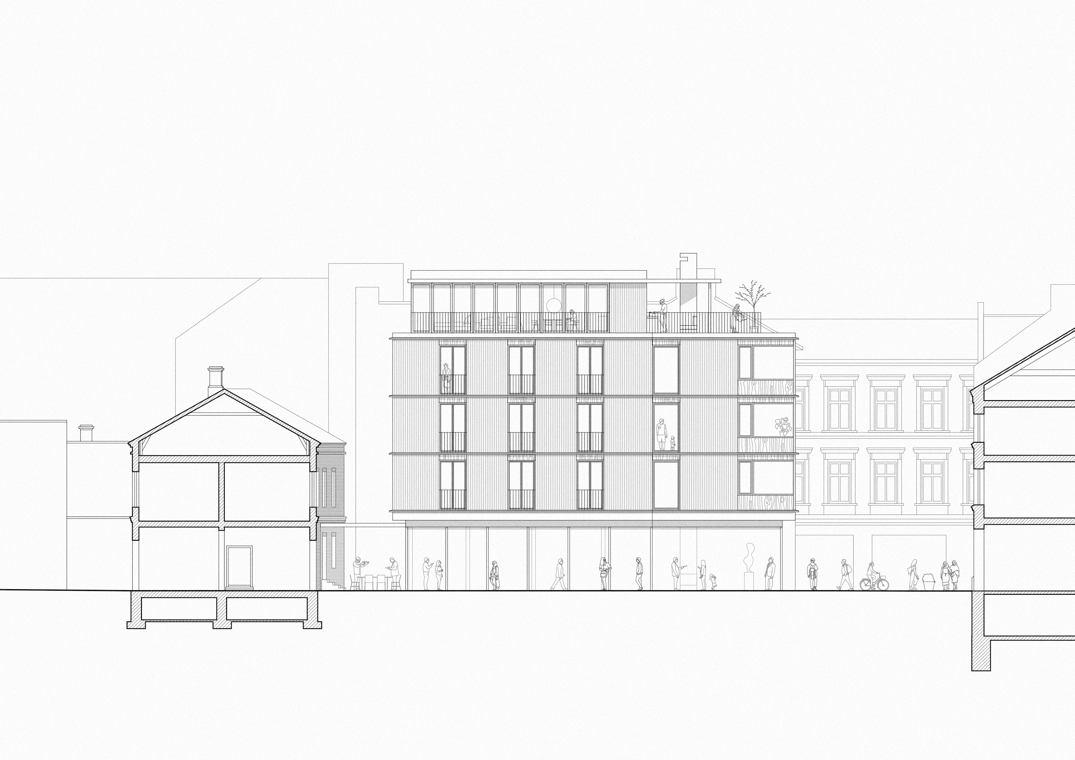 Projektet strävar efter att bevara platsens identitet som ett undantag i stadsväven genom att fortsätta på berättelsen om den öppna tomten. Den befintliga garagebyggnaden från 1800-talet som för närvarande upptar delar av fastigheten ses som ett historiskt lager värt att bevara. Den nya huvudbyggnaden byggs därför endast längs brandväggen i den södra delen av tomten. Denna strategi möjliggör bland annat en offentlig ficka i anslutning till gatan, som ett arv från platsens historiska öppenhet. Fickan är tänkt att fungera både som en förlängning av gatumiljön och som komplement till de offentliga funktionerna i byggnadens bottenvåning.