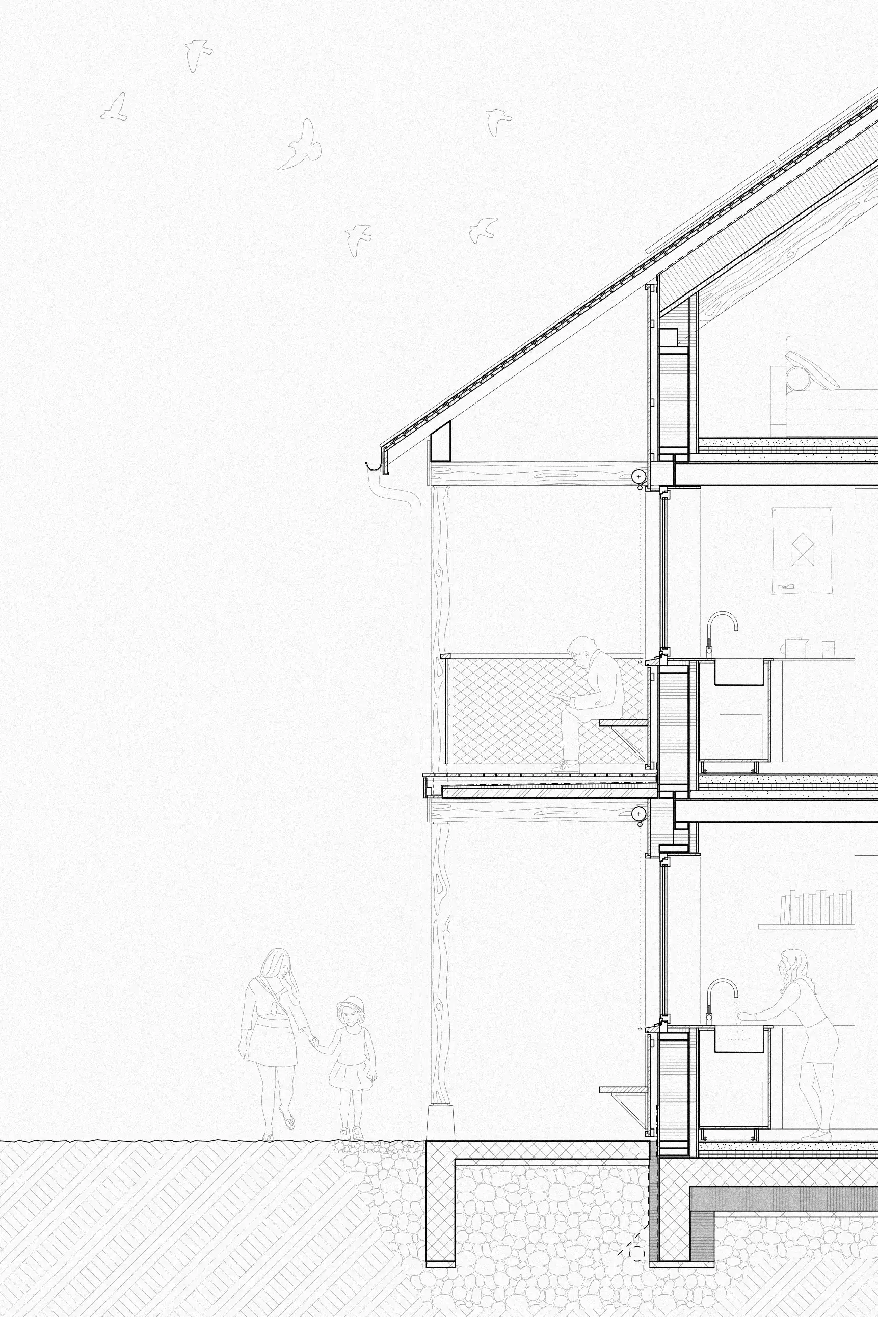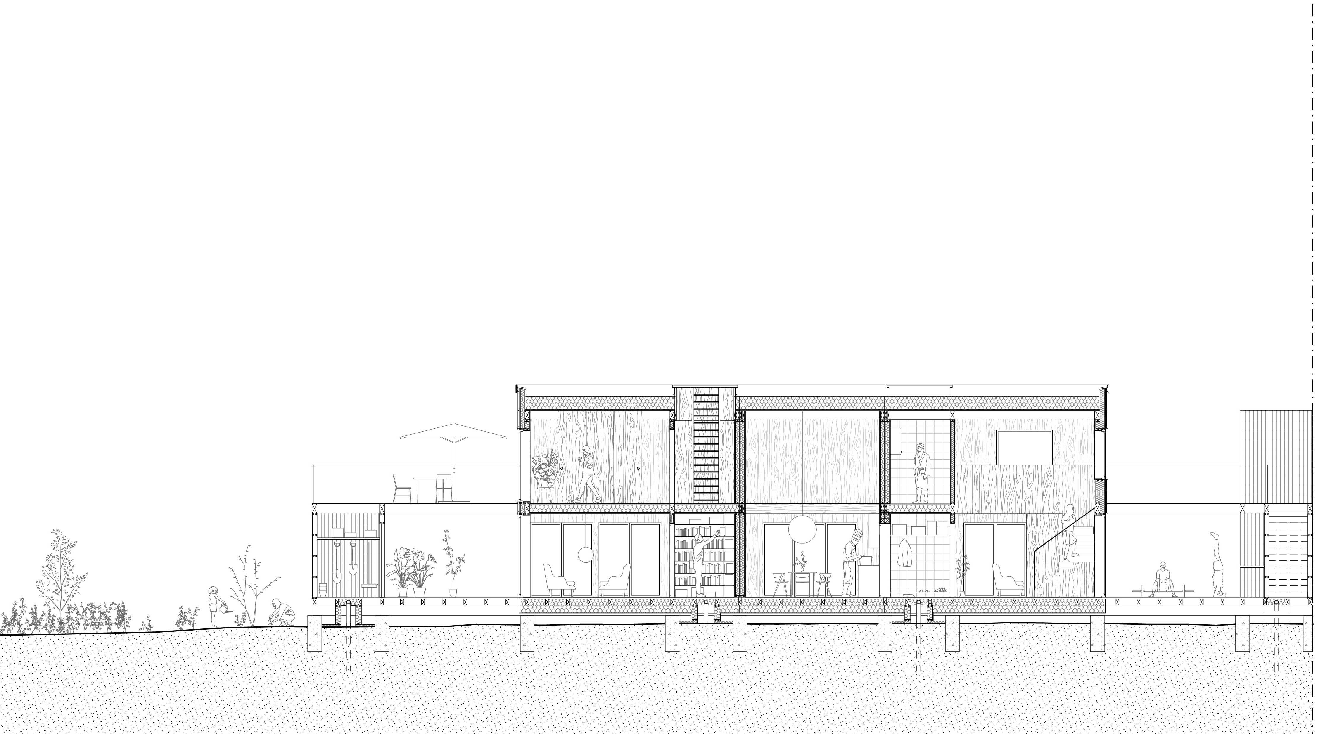 Den nya byggnaden erbjuder flexibla bostäder i träkonstruktion, utformade för olika livssituationer – från kompakta 2,5-rumslägenheter till en generös 5-rumslägenhet under sadeltaket. De västvända loftgångarna fungerar som sociala rum med privata nischer som kan möbleras och användas för plantering, vilket på sätt och vis leder trädgården hela vägen fram till lägenhetsentrén.