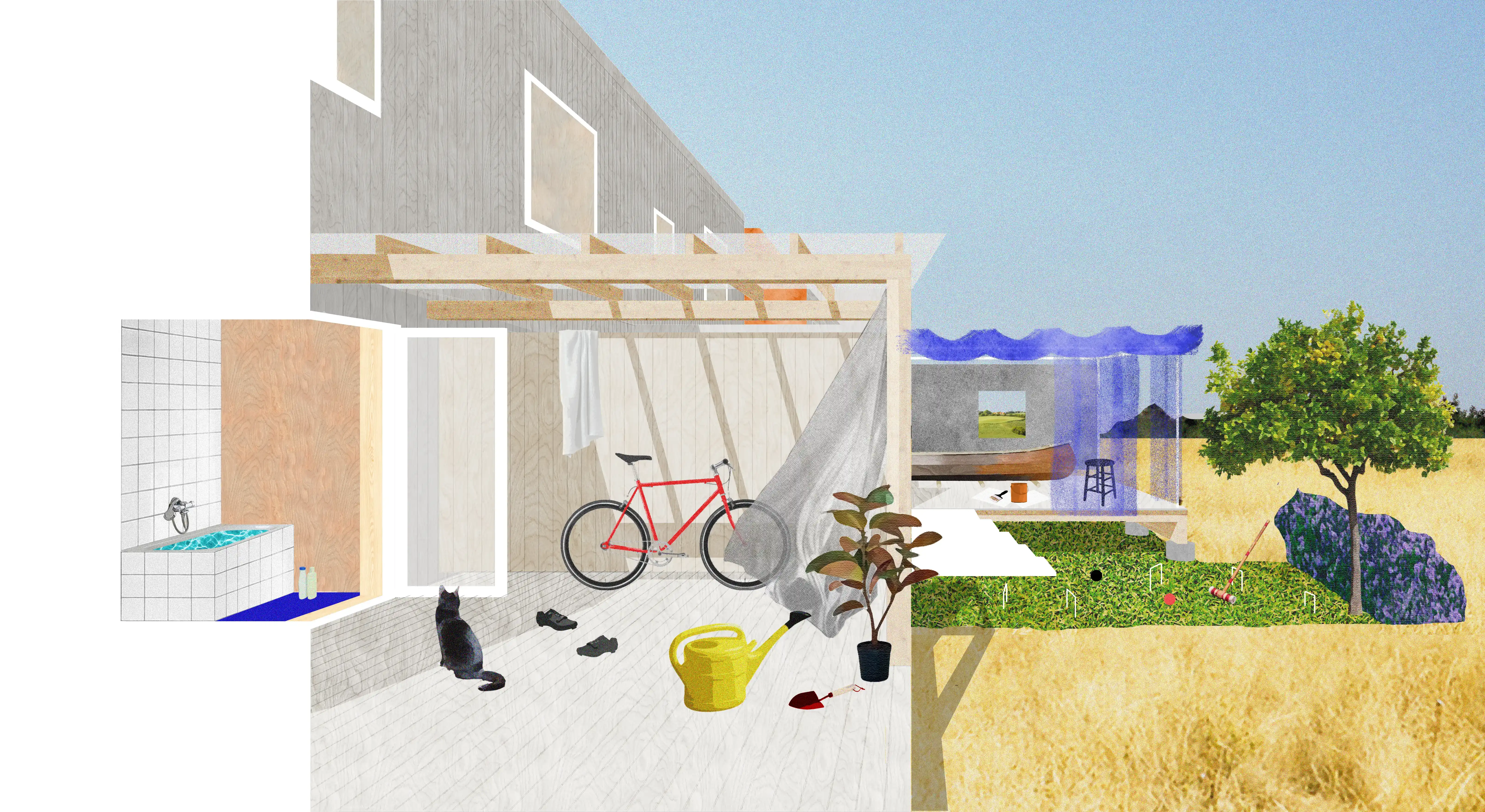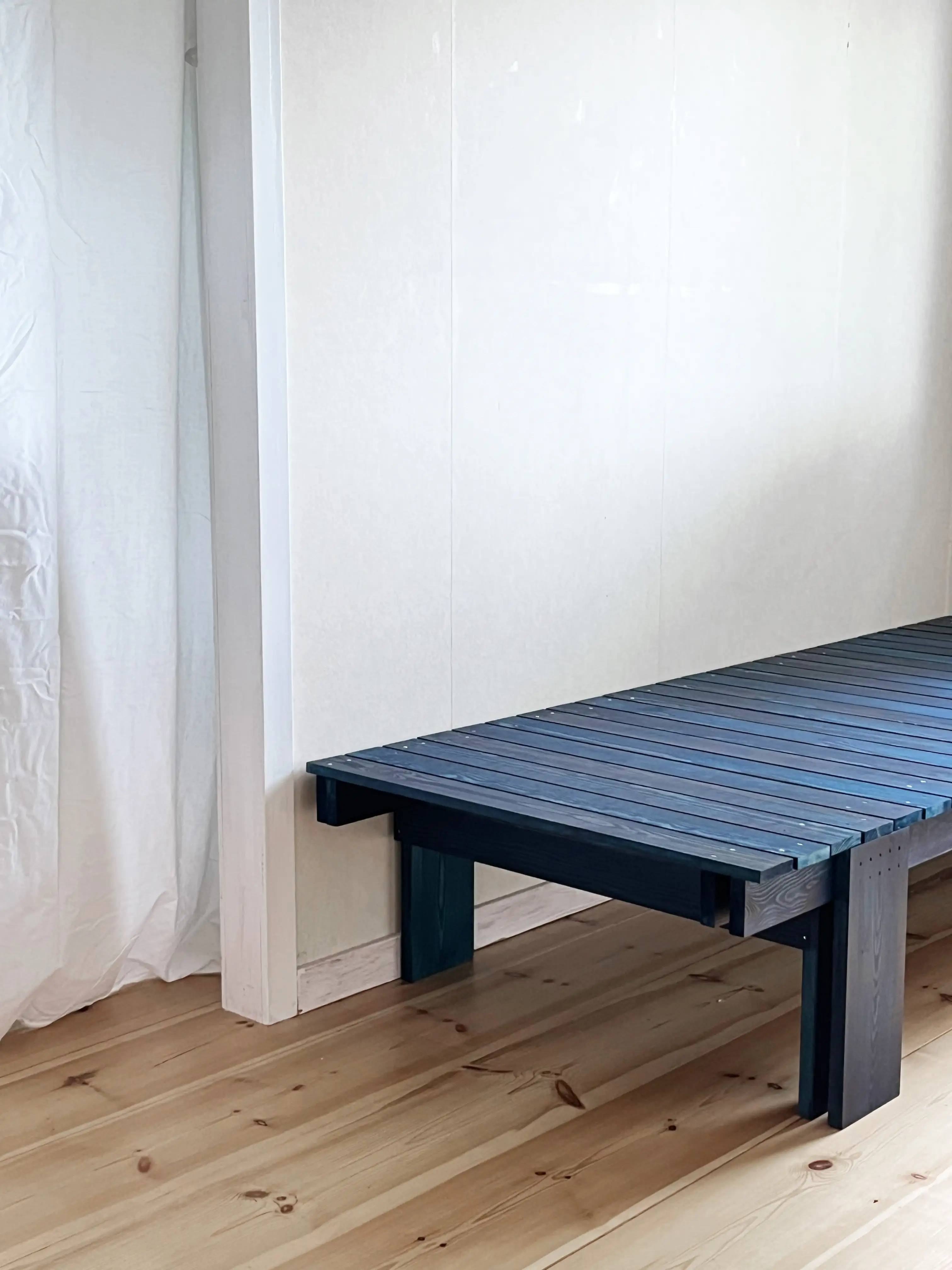 Formgivningen av dagbädden tar avstamp i den gör det själv-anda som präglar sommarstugan som den står i. Det resulterade i en ambition om ett uppriktigt formspråk baserat på lagerförda virkesdimensioner med enkla möten och synliga infästningar.