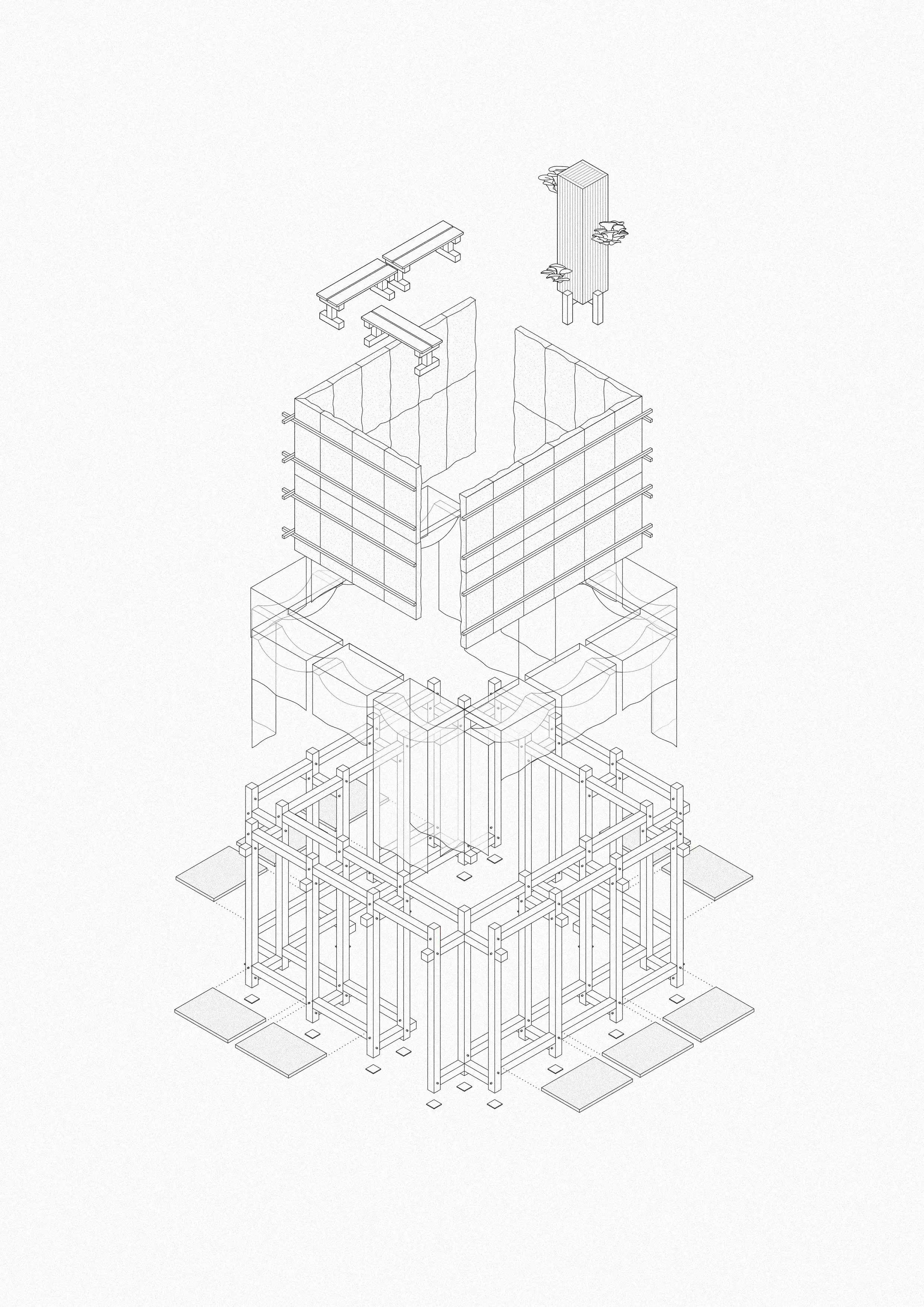 Det rumsliga konceptet för paviljongen härrör från innergårdarnas egenskaper. Träkonstruktionen och mycelpanelerna formar en inhägnad. På utsidan är erbjuder paviljongen en mångsidig struktur för offentliga program, information och utställningsmaterial.Inuti definieras ett intimt, avskärmat rum. Här kan besökarna finna en stund att reflektera, samtidigt som de utforskar de taktila, poetiska och sensoriska egenskaperna hos mycelpanelerna på nära håll.