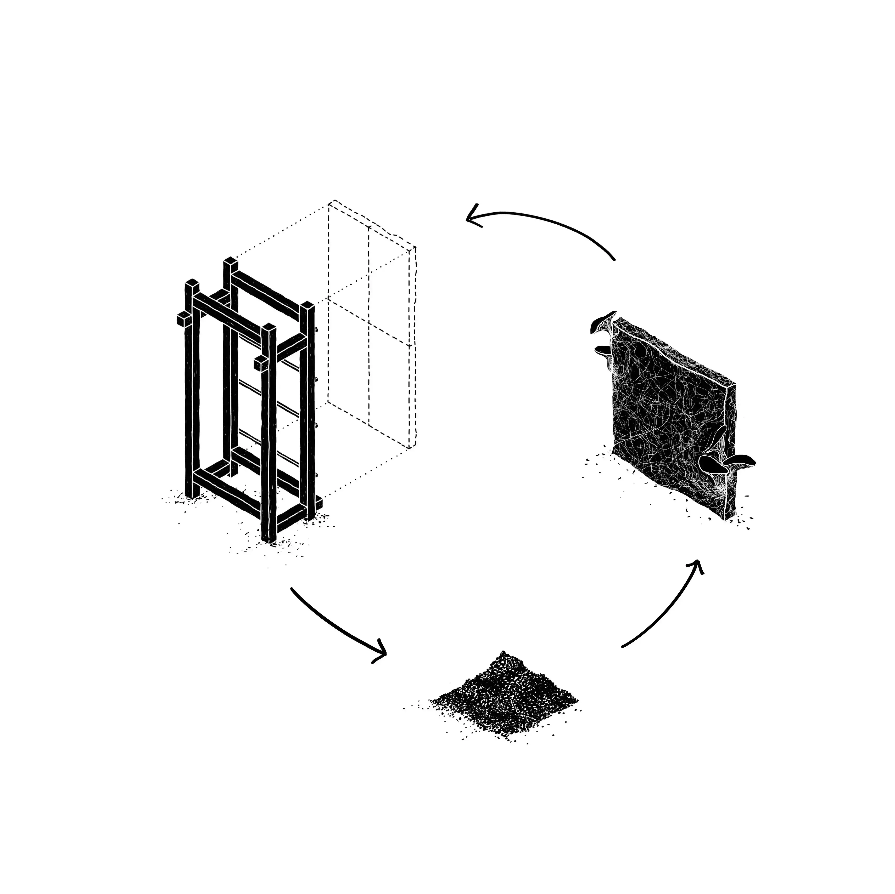 Materialkonceptet för paviljongen kan ses som en förlängning av det ömsesidiga förhållande som finns i naturen mellan mycelet och träden. När träramen till paviljongen tillverkas samlas sågspånet upp. Detta används sedan som substrat från vilket mycelpanelerna till paviljongen växer genom att extrahera näringsämnen från cellulosan. På så sätt bidrar mycelets nedbrytande egenskaper till att skapa ett slutet kretslopp och förverkliga en paviljong med minimalt avfall. Träkonstruktionen är gestaltad med traditionella, lokala träfogar, vilket möjliggör en hållbar monterings- och demonteringsprocess samt intressanta tektoniska egenskaper.