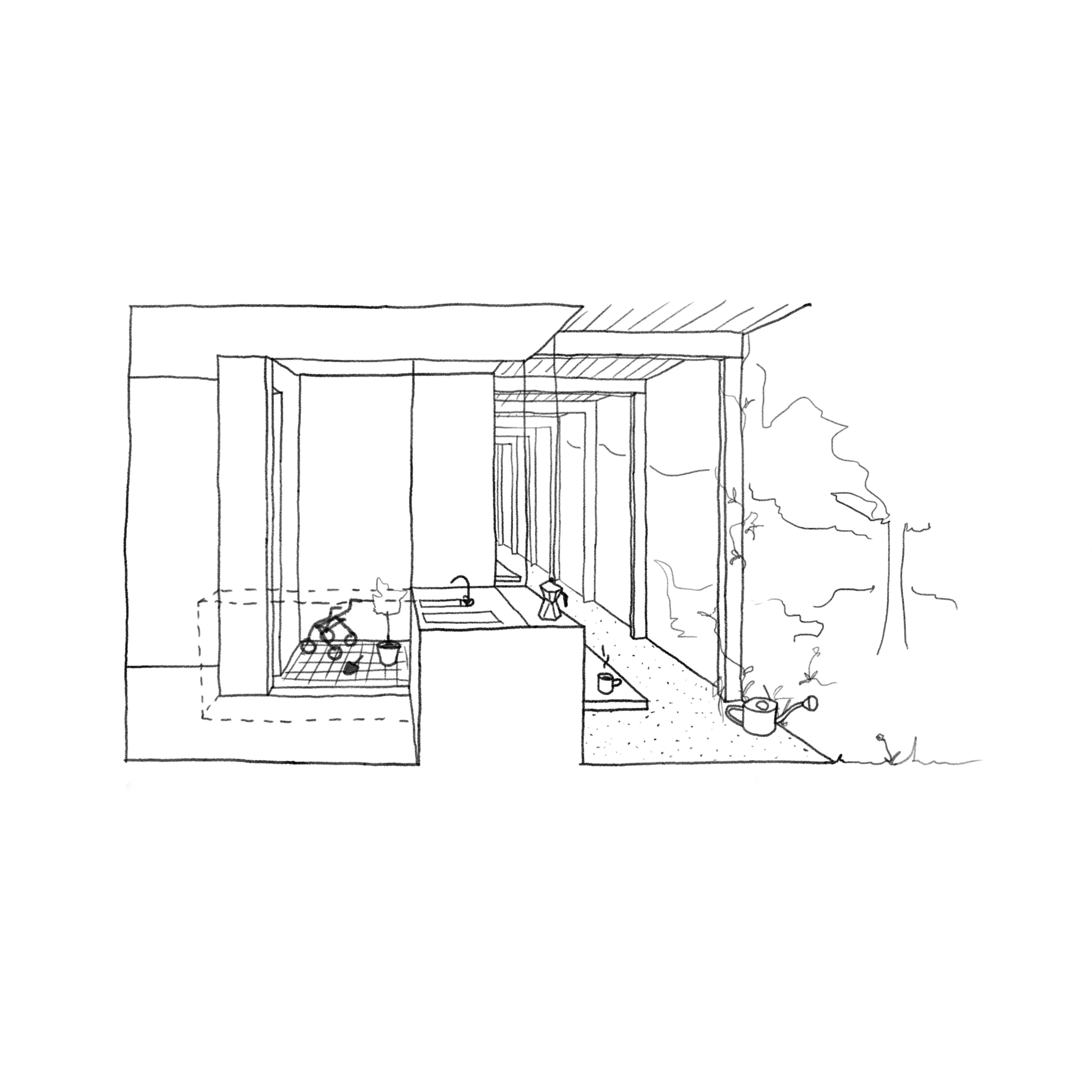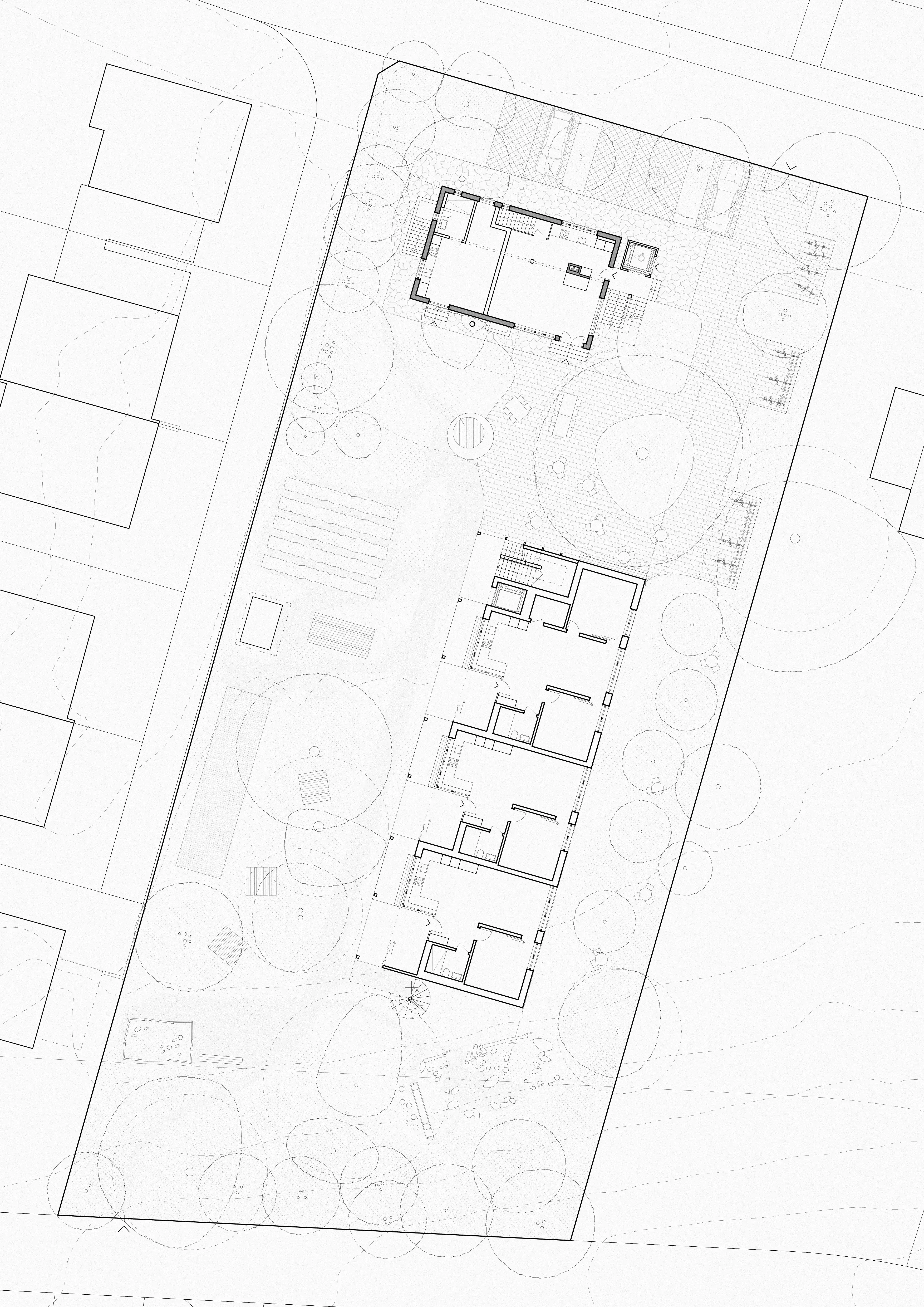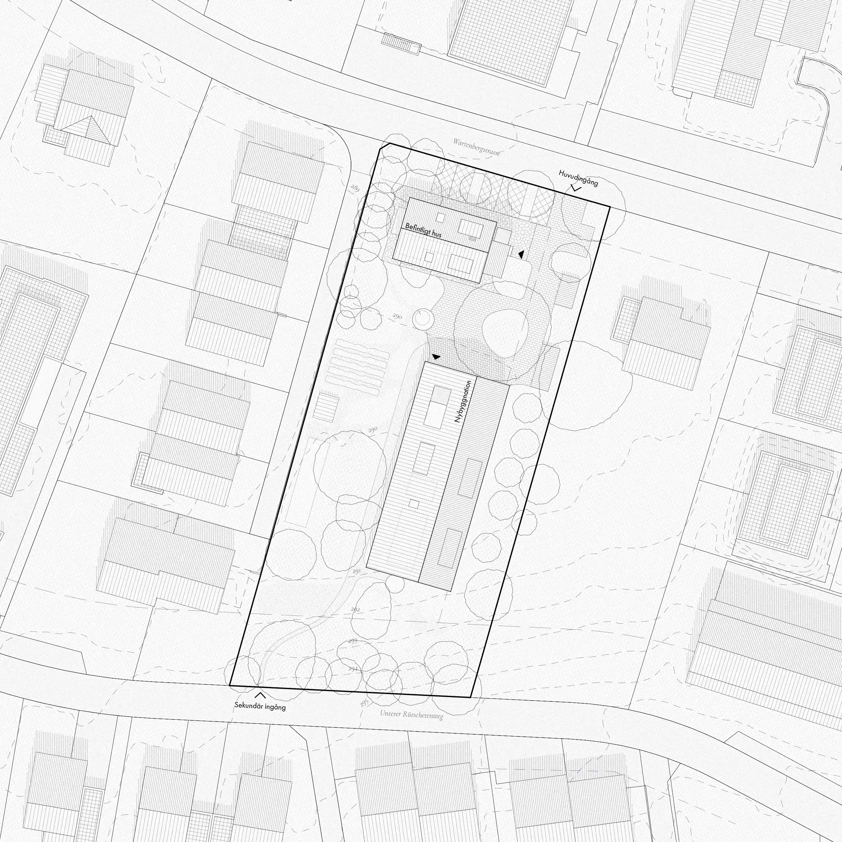 Tävlingsförslaget utgår från platsens unika karaktär; den frodiga trädgården som en grön oas och det robusta befintliga huset. En ny byggnadsvolym föreslås längs tomtens östra gräns, varsamt inpassad mellan fastighetens karaktäristiska lindträd i norr och sluttningen i söder.