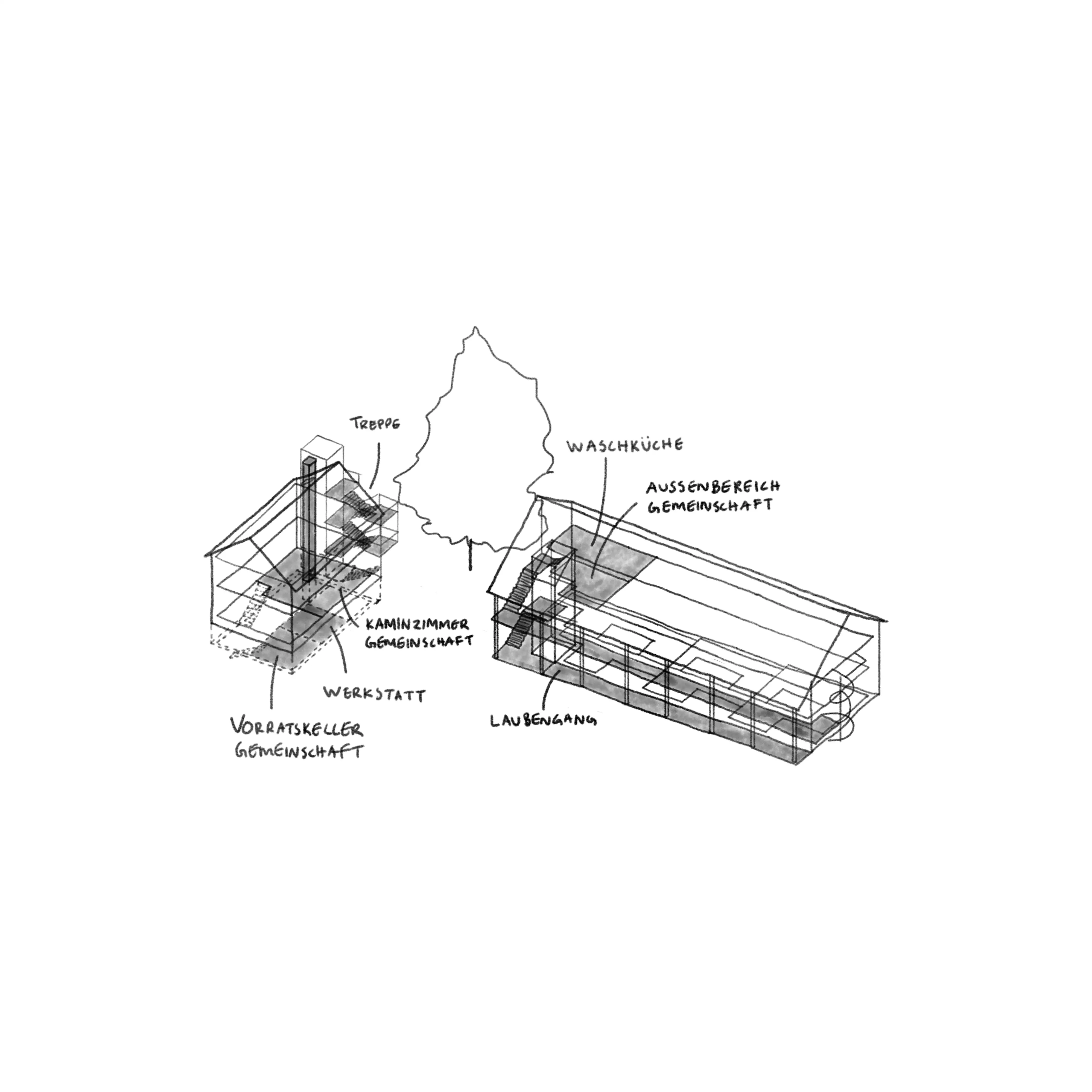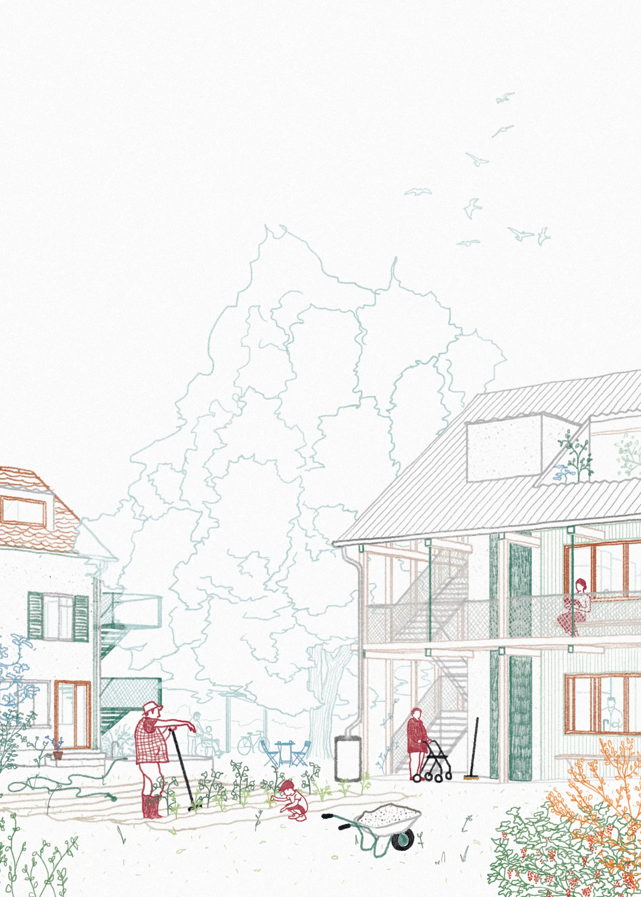 Projektet främjar gemenskap och mångfald. Den centrala trädgården fungerar som hjärtat i anläggningen, kompletterad av delade funktioner som tvättstuga med takterrass, gemensamhetslokal med kamin mot torget samt verkstad och förråd för trädgårdens skörd. En öppen loftgång i den nya byggnaden fungerar som social övergångszon mellan lägenheterna och trädgården.
