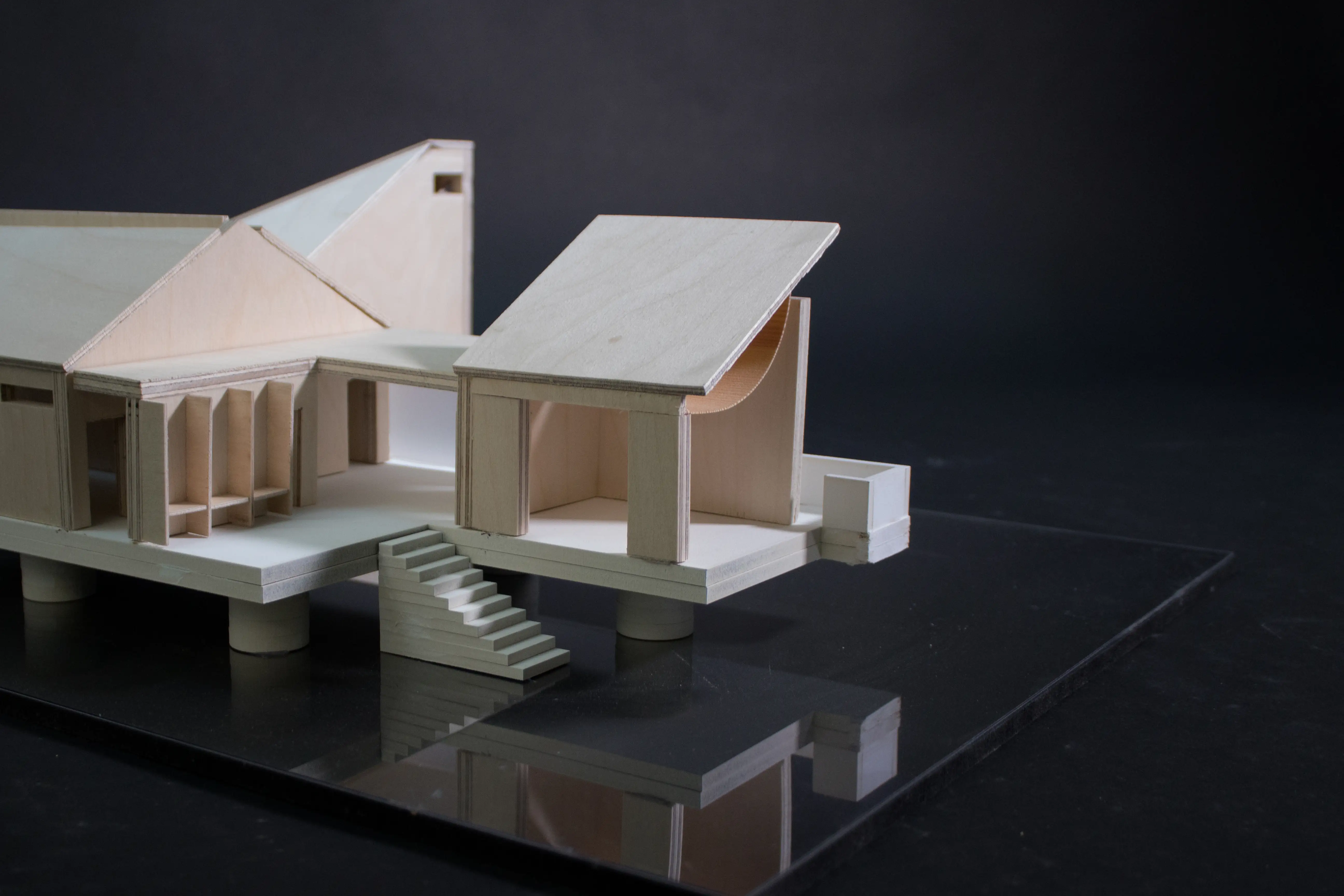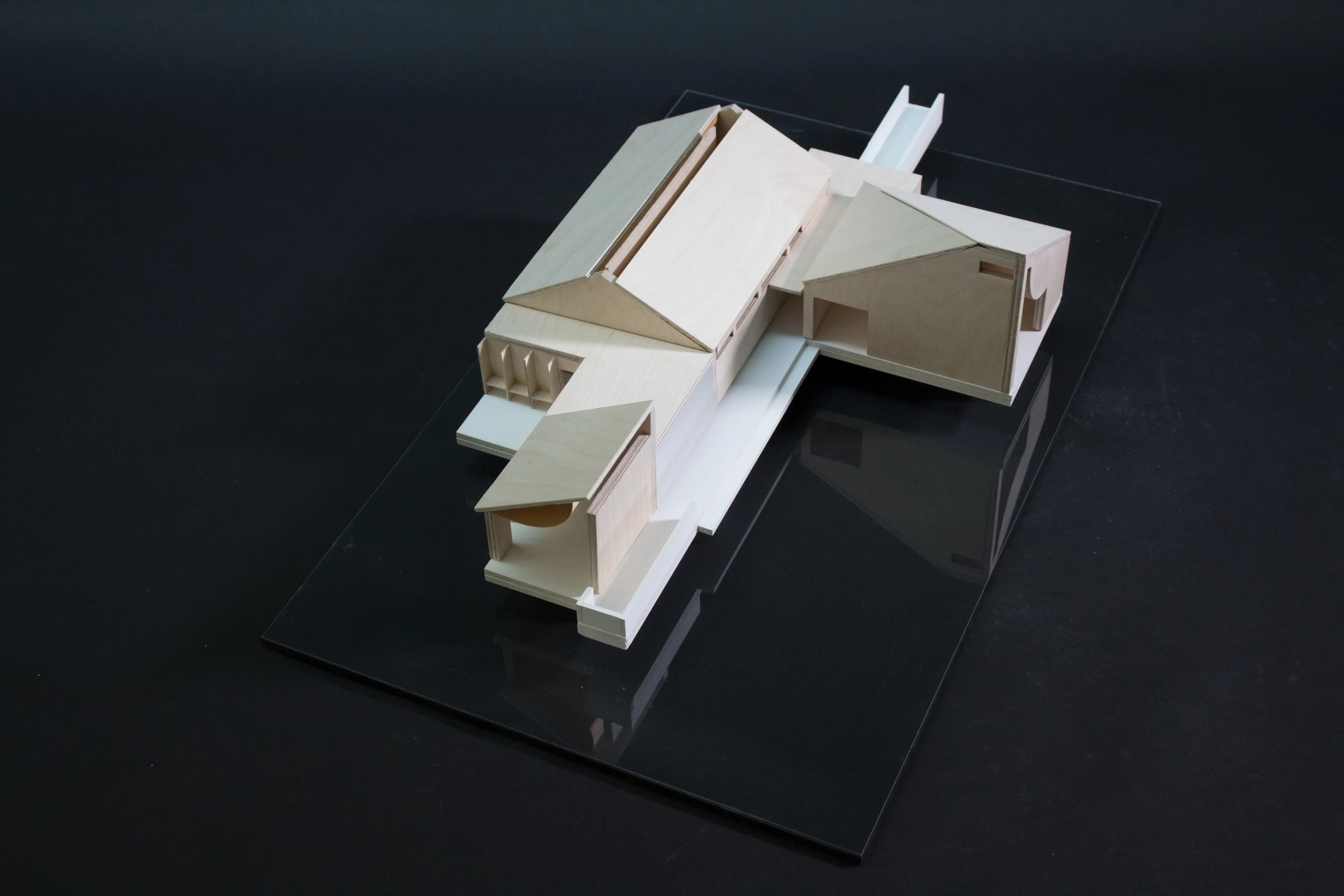 Konstruktionen bygger på ett rationellt system av prefabricerade träelement med korta spännvidder och bärande tvärväggar. Endast marknära delar utförs i betong. Materialpaletten är dämpad och naturlig, i dialog med det befintliga huset. Den asymmetriska takformen och de enkla detaljerna ger byggnaden en samtida men lågmäld närvaro i den lummiga miljön.