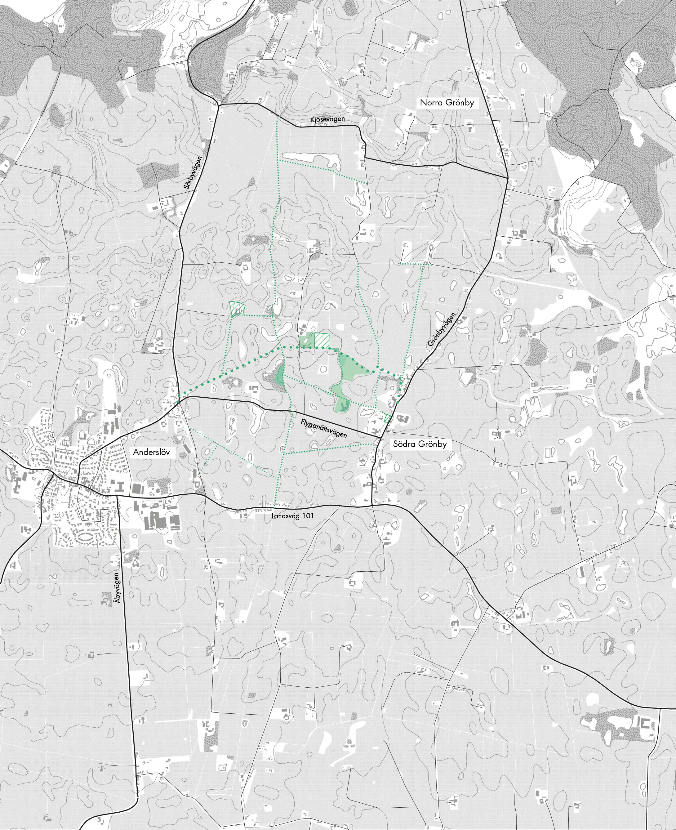 Projektet är mitt examensprojekt i arkitektur vid Lunds Tekniska Högskola. I projektet söks en balans mellan den högproduktiva jordbruksmarken och de boendemiljöer som existerar sida vid sida i södra Skåne. Projektet fokuserar på byn Grönby i utkanten av Trelleborgs kommun som en slags testbädd. I södra Skåne är många byar likt Grönby omgärdade av ett landskap starkt präglat av ett storskaligt jordbruk. Här återfinns den allemansrättsliga marken fragmenterad och utspridd på olika åkerholmar, märgelgravar, träddungar och åkergränser. För de boende innebär det ett starkt bilberoende och få möjligheter att utforska det omkringliggande landskapet.